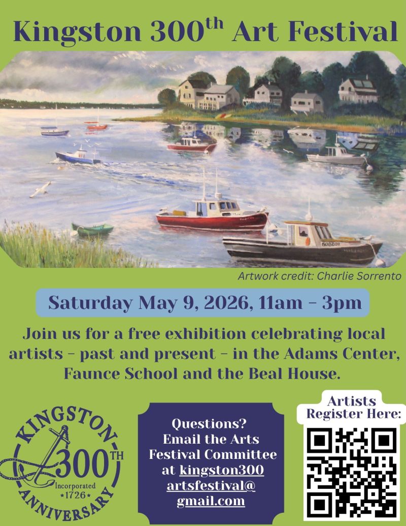 - Call For Art - Kingston's 300th Anniversary Art Festvival The Town Of Kingston is hosting an art festival Saturday, May 9th 11am - 3pm for our town's 300th anniversary. We wanted to reach out to anyone (15 years of age or older to enter) who...